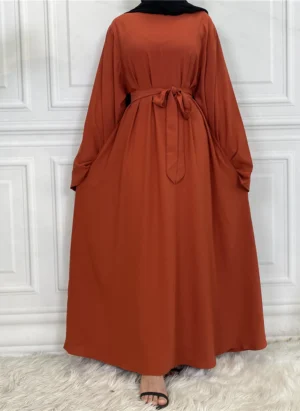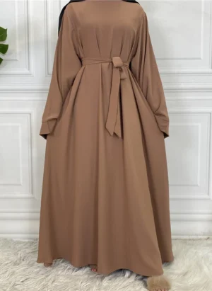 Plain Abaya with Belt and Large Sleeves Light Brown Color with Dupatta in Firdous Material